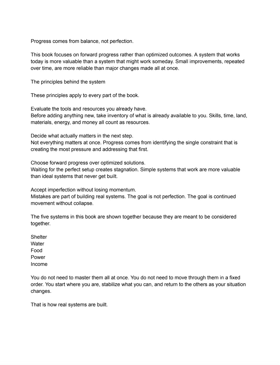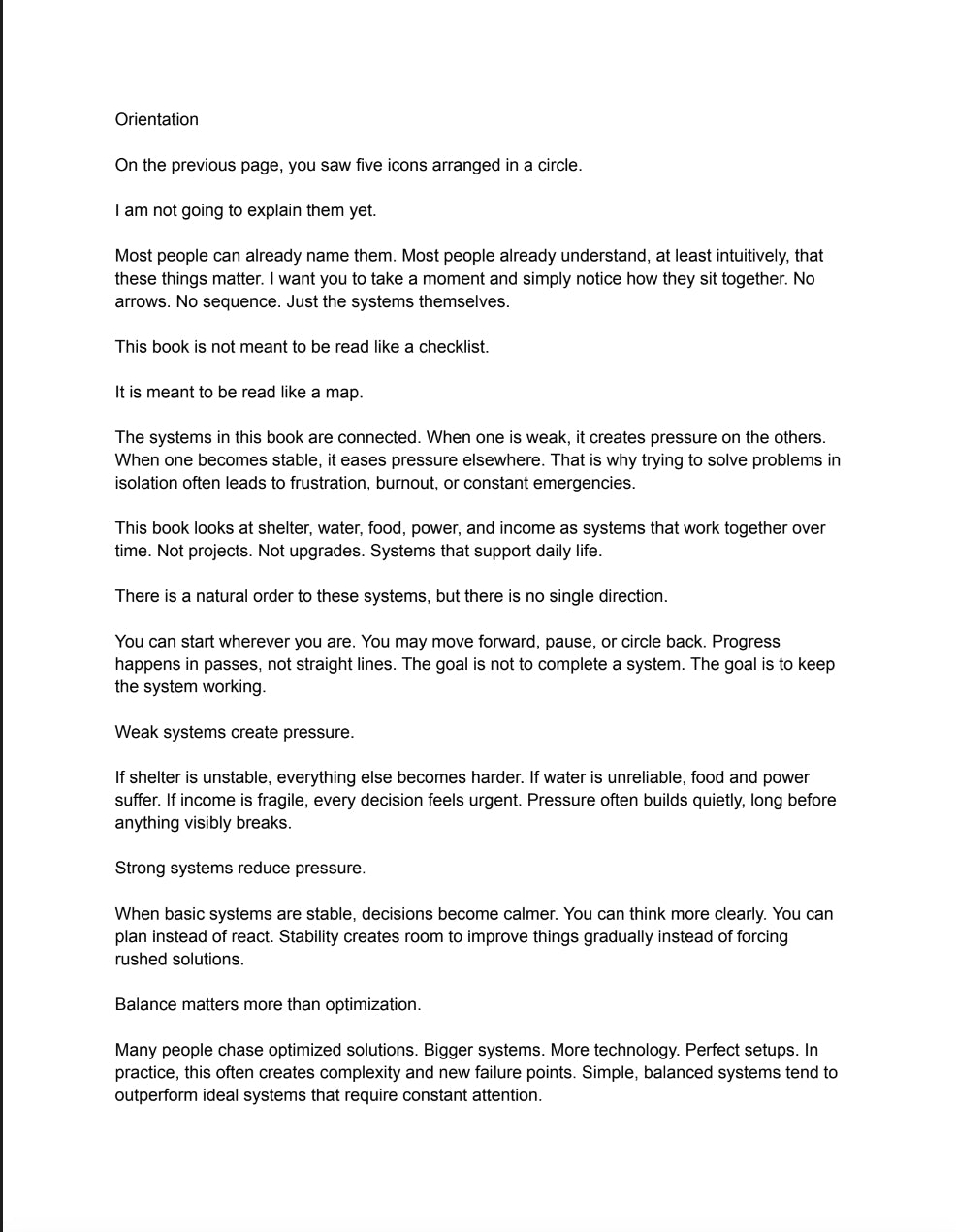 It is for people who want to understand how shelter, water, food, power, and income actually interact, instead of trying to fix each one in isolation.